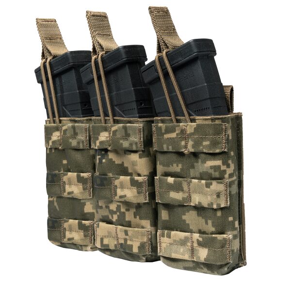 Підсумок для трьох магазинів «АК-3 Gen.2» відкритий MM-14 NIR розроблений у межах програми БКС «АРСЕНАЛ» для швидкої та надійної роботи з магазинами АК та AR. Коробчаста конструкція забезпечує стабільне утримання, безшумне носіння та високу швидкість вилучення. Регульовані гумові стропи дозволяють працювати «наосліп» і сумісні з магазинами різних виробників, у тому числі з хватами Magpul. Відсутність окантовки робить підсумок вужчим і дає щільне розміщення по MOLLE без пропусків слотів. Виконання NIR знижує помітність у ПНБ.