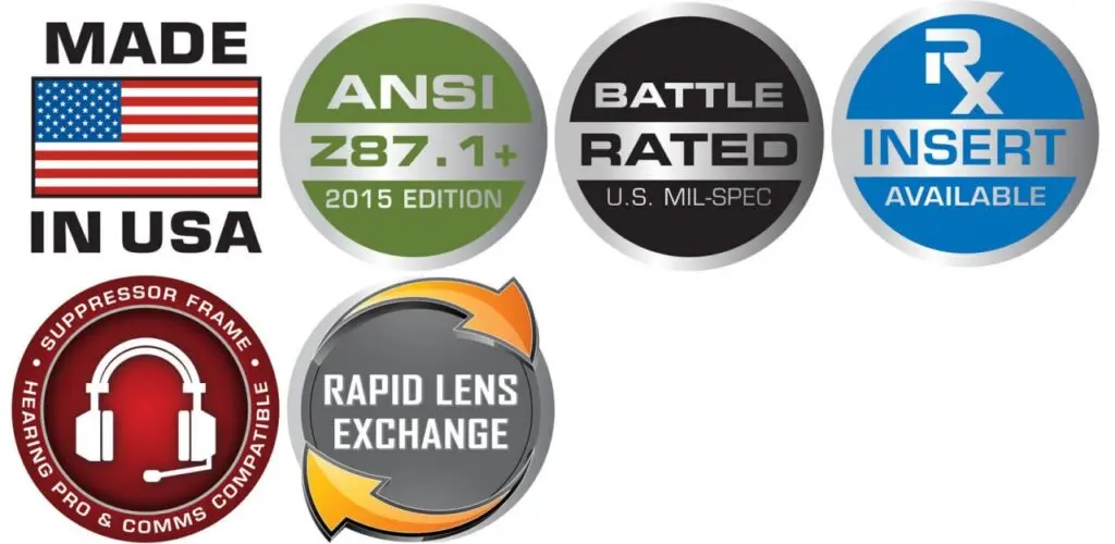 - Відповідність вимогам різних стандартів безпеки гарантує високий рівень захисту очей користувача US MIL SPEC MIL-PRF-32432, ANSI Z87.1-2015, CE EN 166 та Федерального агентства з охорони праці США.